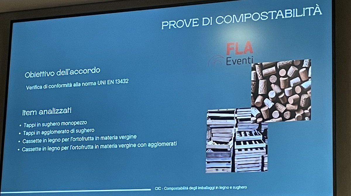 Jenny Campagnol del Consorzio Italiano Compostatori ha presentato i risultati delle prove di compostabilità e biodegradabilità degli imballaggi in legno e sughero sulla base dei requisiti richiesti dalla norma UNI EN 13432. Questi due materiali soddisfano tutti i requisiti, tranne la disintegrazione, la principale criticità, poiché i tempi di tale processo sono molto più lunghi rispetto agli 84 giorni previsti dalla norma.