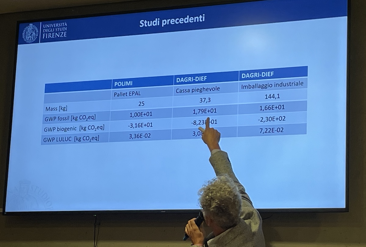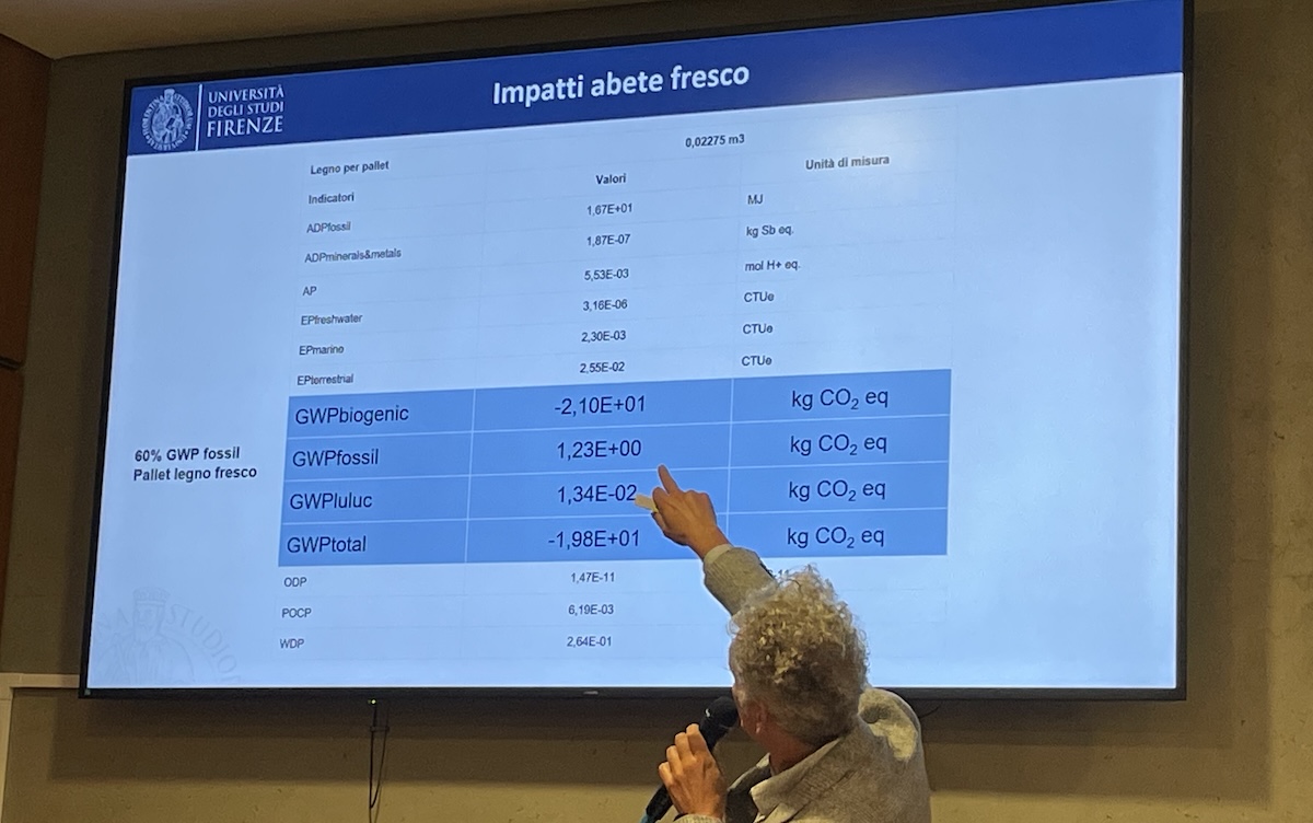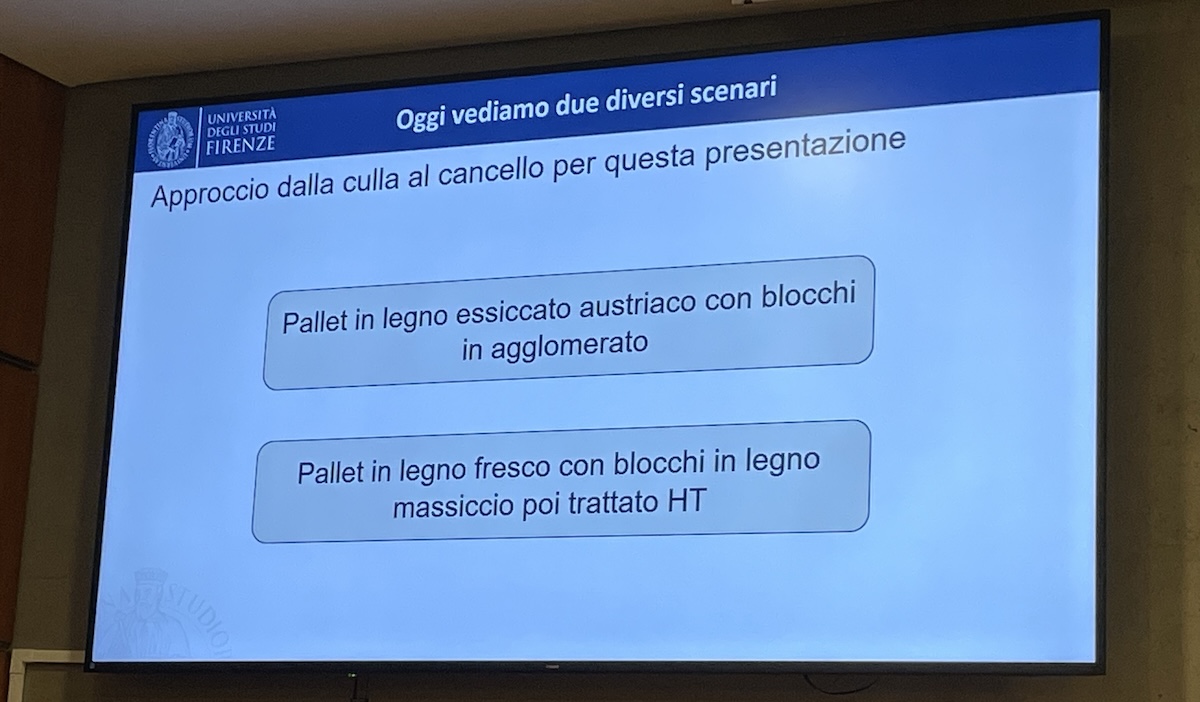 Giacomo Goli e Massimo Delogu dell’Università degli Studi di Firenze, mostrando uno studio sull’ecoprofilo di un pallet in legno essiccato austriaco con blocchi in agglomerato e uno in legno fresco con blocchi in legno massiccio poi trattato HT, hanno evidenziato come possa essere possibile un approccio 'open data' ed hanno posto le basi per lo sviluppo di un tool di calcolo generalizzabile a qualunque tipologia di pallet. Come già evidenziato in studi precedenti, i due pallet studiati hanno mostrato un ecoprofilo estremamente interessante con qualche vantaggio per il legno massiccio fresco che ovviamente subisce un numero inferiore di trasformazioni.